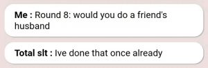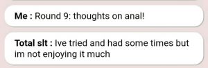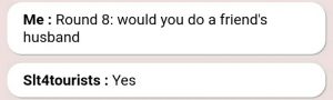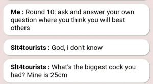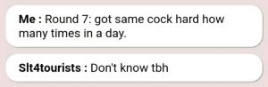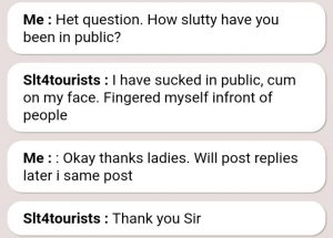 Me : Okay. I am going to have a SLUT contest. “Total Slt” versus “Slt4tourists”. Show me something!